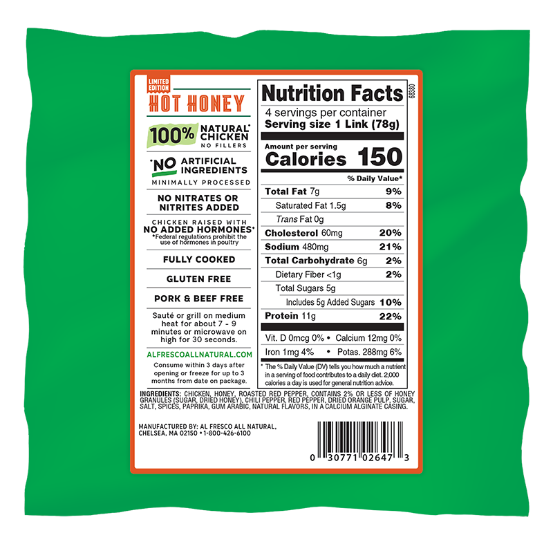 CHICKEN, HONEY, ROASTED RED PEPPER, CONTAINS 2% LESS OF HONEY GRANULES (SUGAR, DRIED HONEY), CHILI PEPPER, RED PEPPER, DRIED ORANGE PULP, SUGAR, SALT, SPICES, PAPRIKA, GUM ARABIC, NATUAL FLAVORS, IN A CALCIUM ALGINATE CASING.