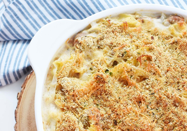 • 5Add egg noodles to the greased casserole dish. Stir in peas. Pour thickened milk mixture over noodles and top with Italian bread crumbs, dried parsley, and cheese.