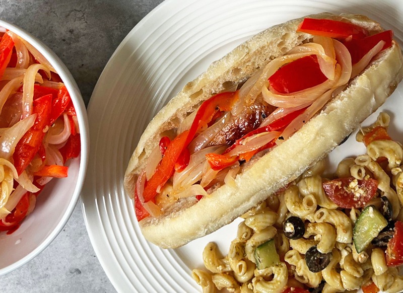 • 5Then when your chicken sausage has fully heated up and it’s grilled to your liking, assemble your roll with the chicken sausage, and then top it off with your caramelized onions and bell peppers! That’s it, enjoy with an easy side or leftovers!